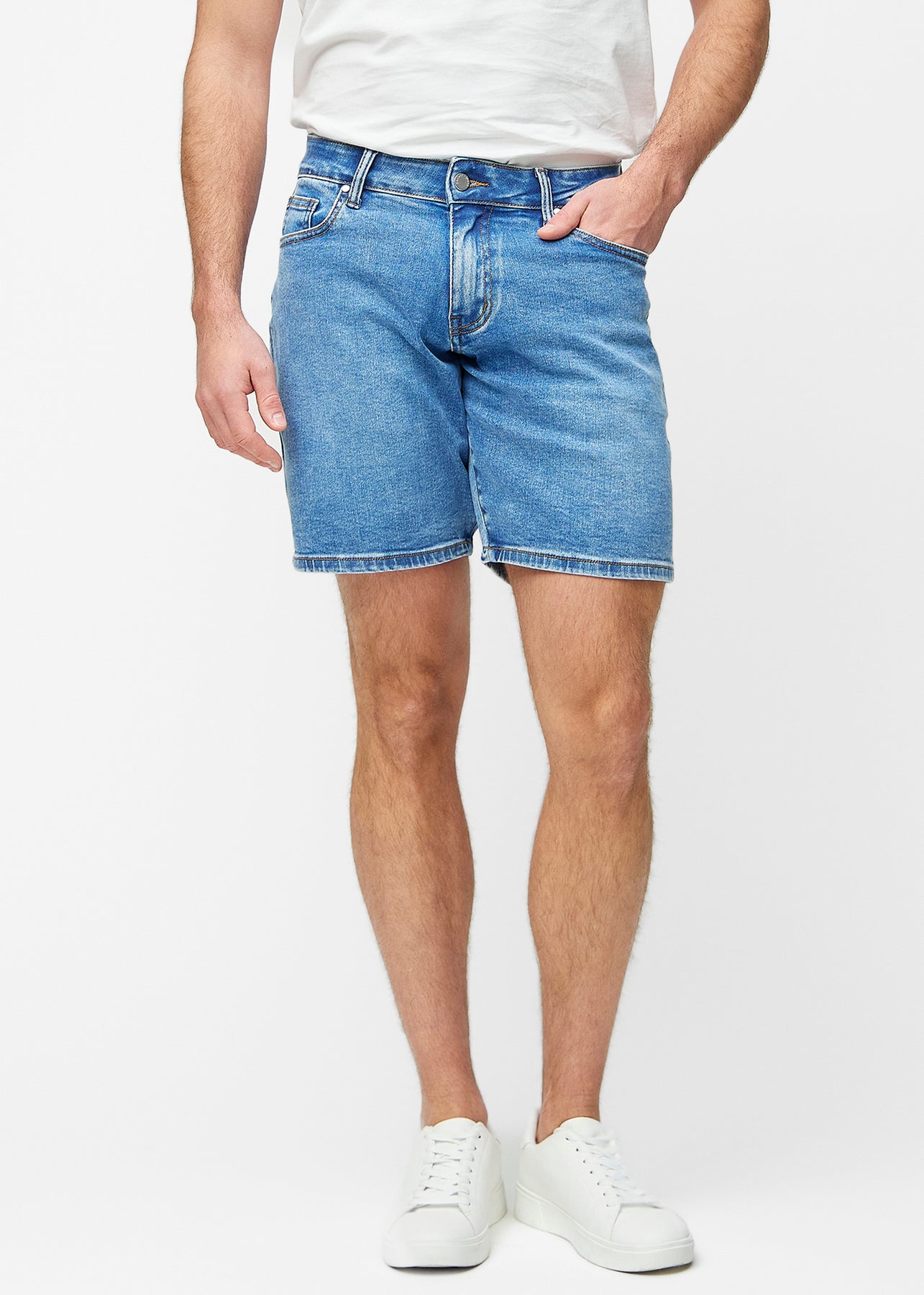 Perfect Shorts - Middle - Regular - Rivers™ Perfect Shorts - Middle - Regular in Rivers are blue denim shorts for men with a classic and timeless look. The fit sits naturally at the hips and has a straight fit that leaves room around the thighs for a comfortable silhouette. The shorts are mid-length and reach just above the knee. The deep pockets at the front and back make them practical and suitable for everyday wear.