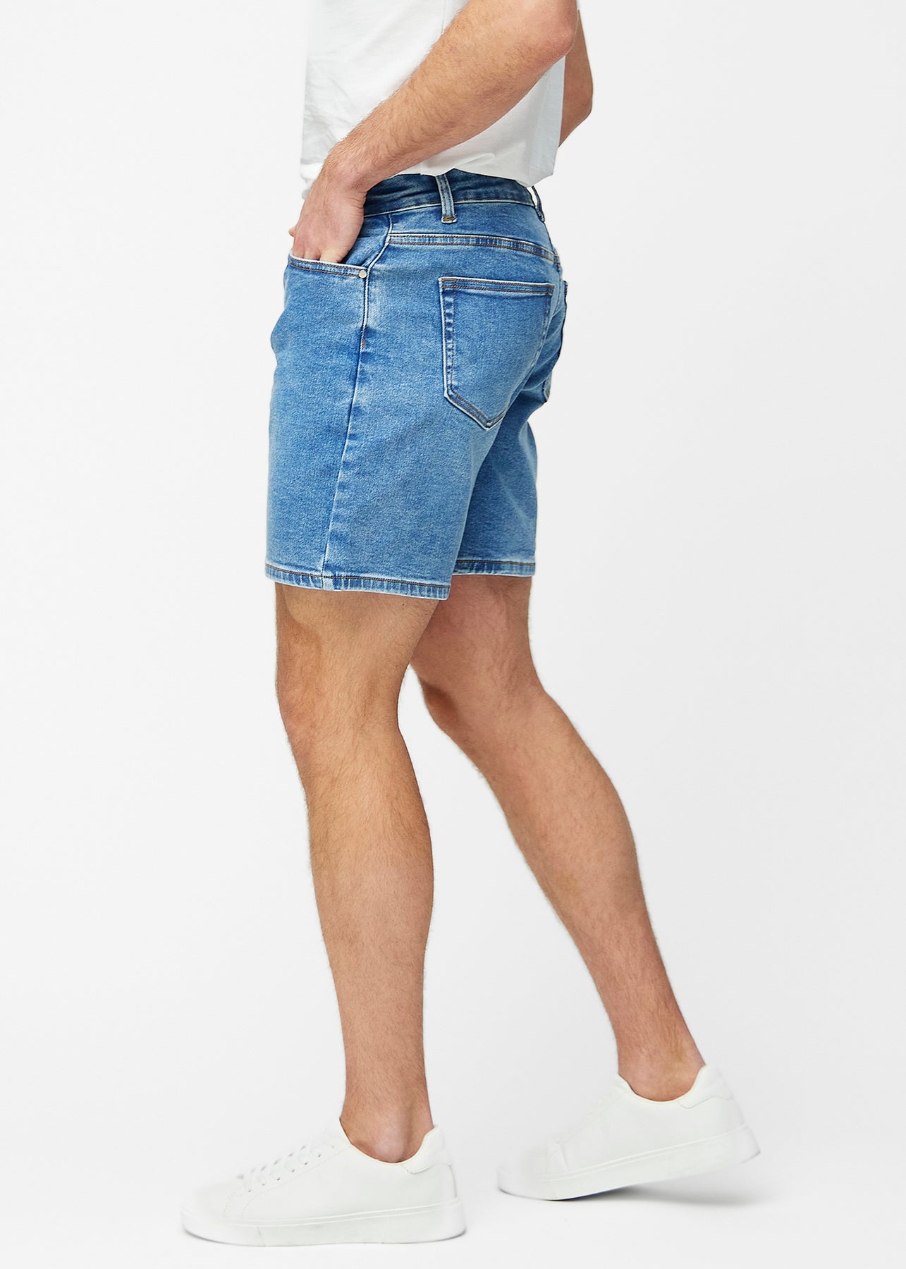 Blue denim shorts for men in the colour Rivers with a regular fit seen from the side on a model.