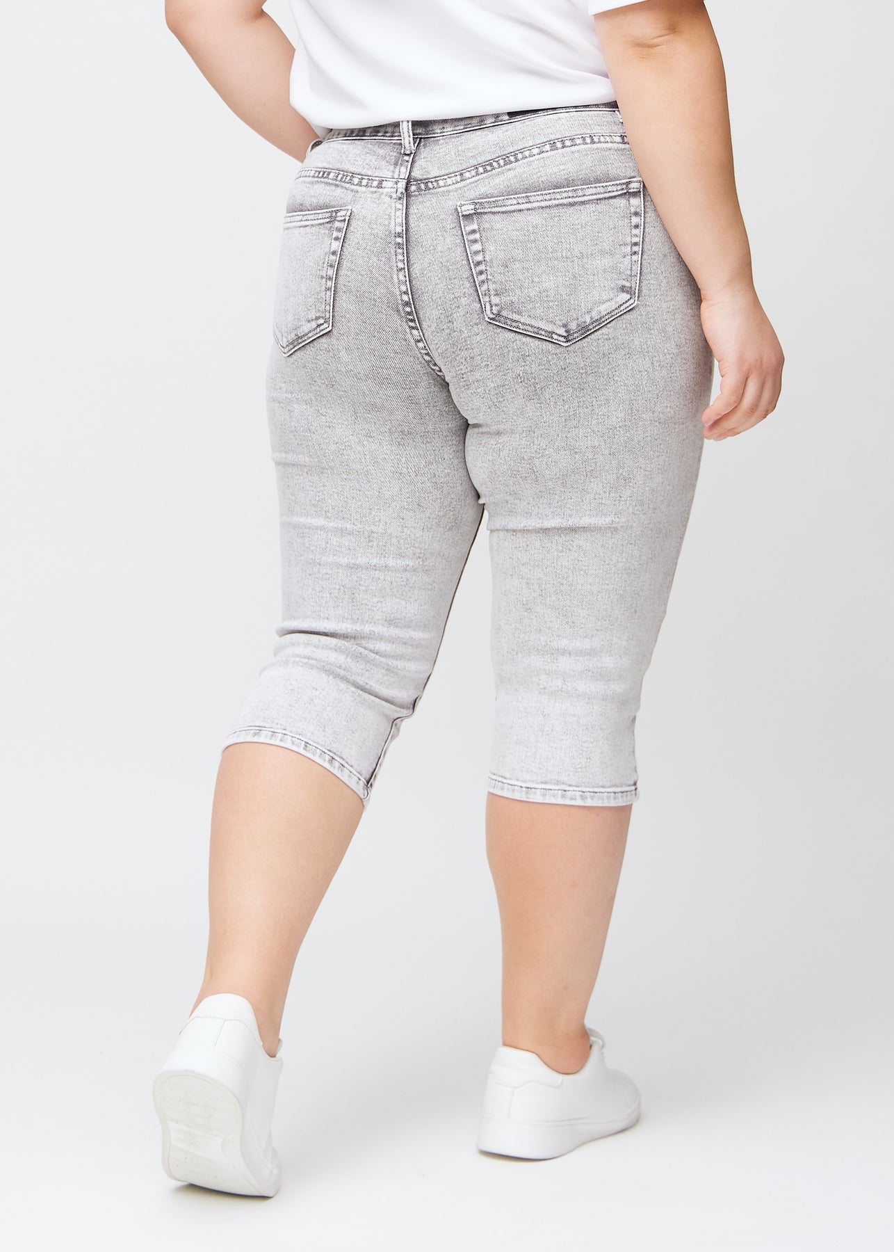 Tæt billede af bagdelen på en plus-size model i lysegrå denim slim capris – detaljefokus på lommer og syninger.